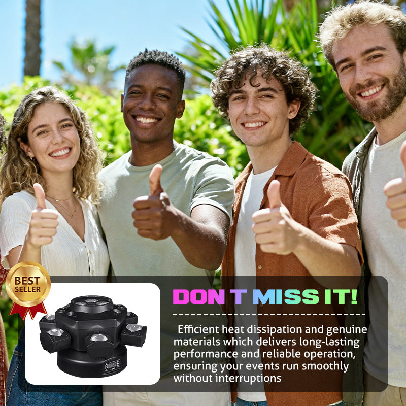 DYNAMICZNA KONSTRUKCJA Z SZEŚCIOMA RAMIONAMI – Posiada sześć niezależnie ruchomych ramion, z których każde emituje silny strumień światła. Tworzy to zapierające dech w piersiach, wypełniające przestrzeń efekty i energetyczne pokazy świetlne, które fascynują każdą publiczność i wzmacniają atmosferę wydarzenia.